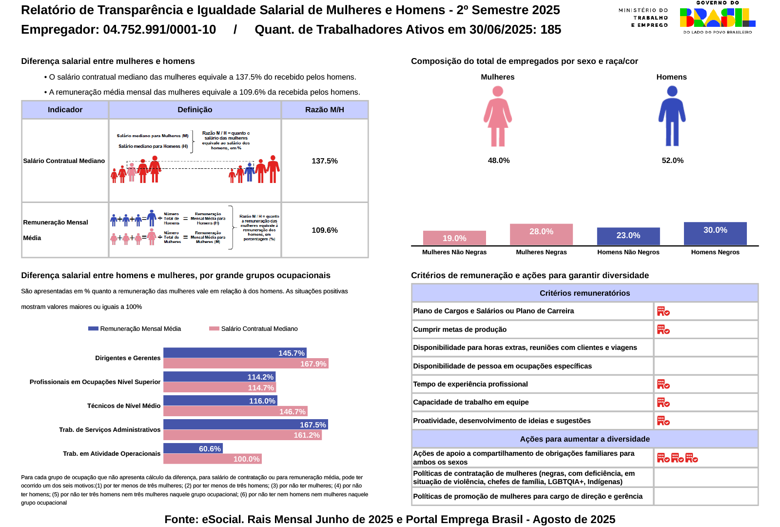 Em conformidade com a lei 14.611/2023, que tem a finalidade de assegurar a igualdade salarial entre Homens e Mulheres em funções equivalentes, a Biomm realizou uma pesquisa e disponibilizou as informações ao governo e com isso temos o relatório abaixo: